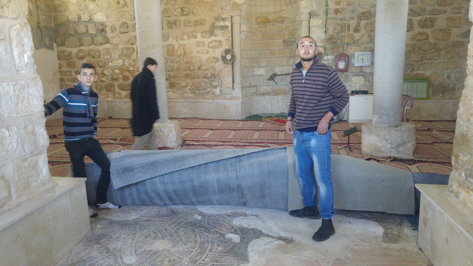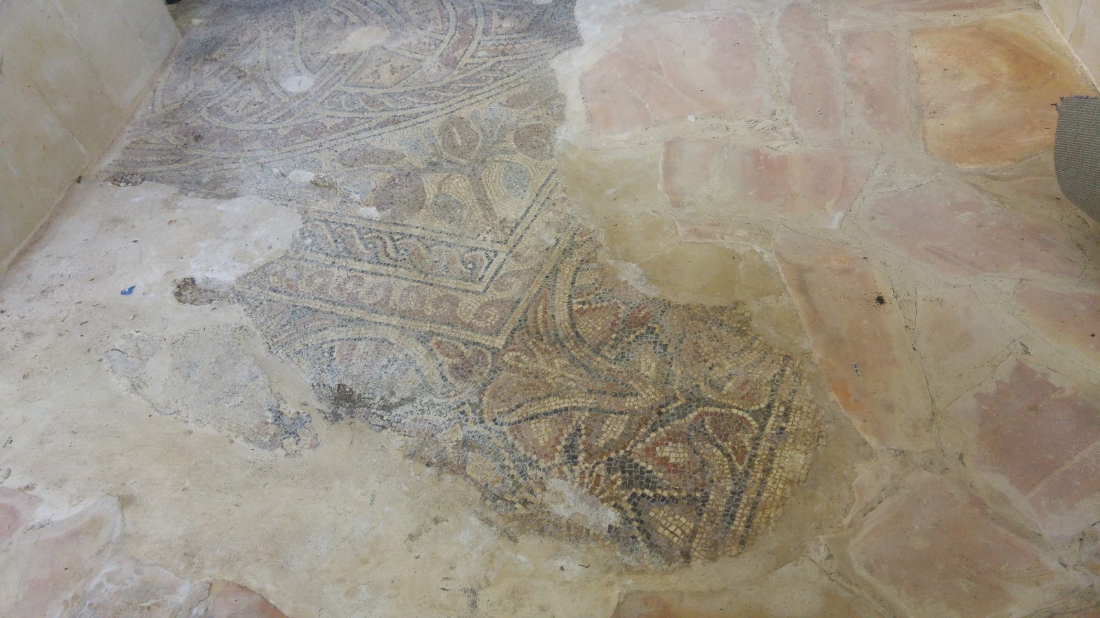 أمامك على أرضيته فسيفساء من العهد الأموي تآكل نصفها وتدمر بفعل السرقات